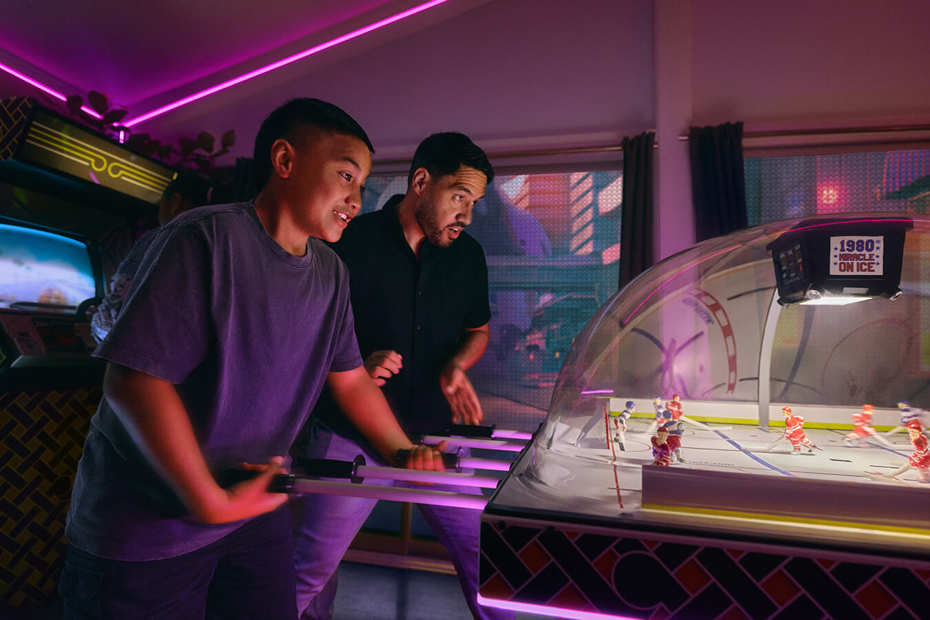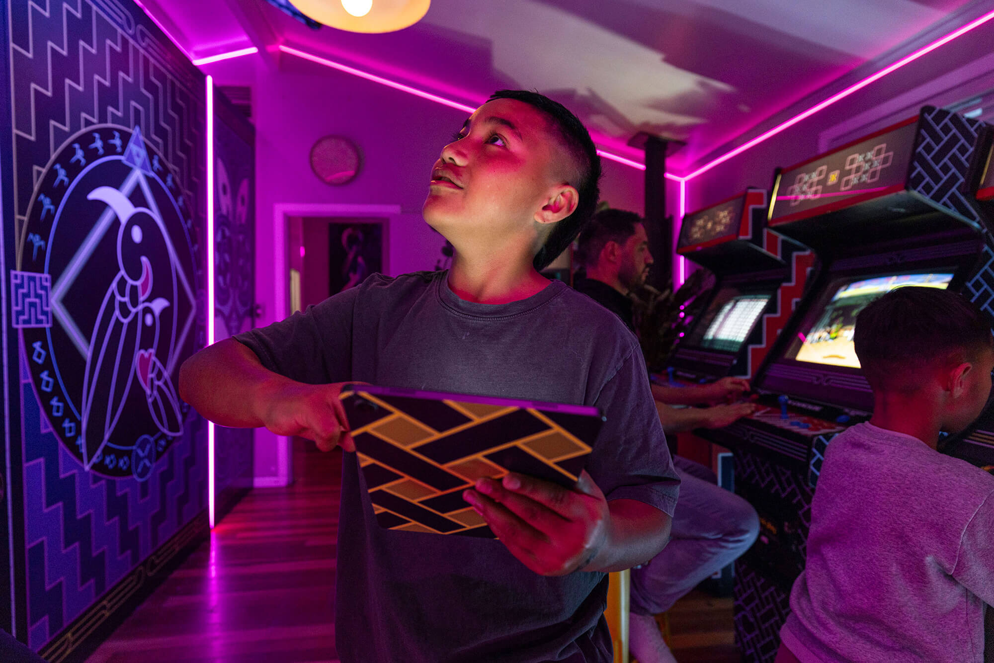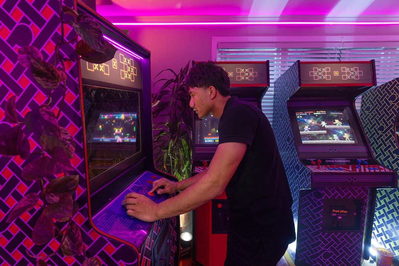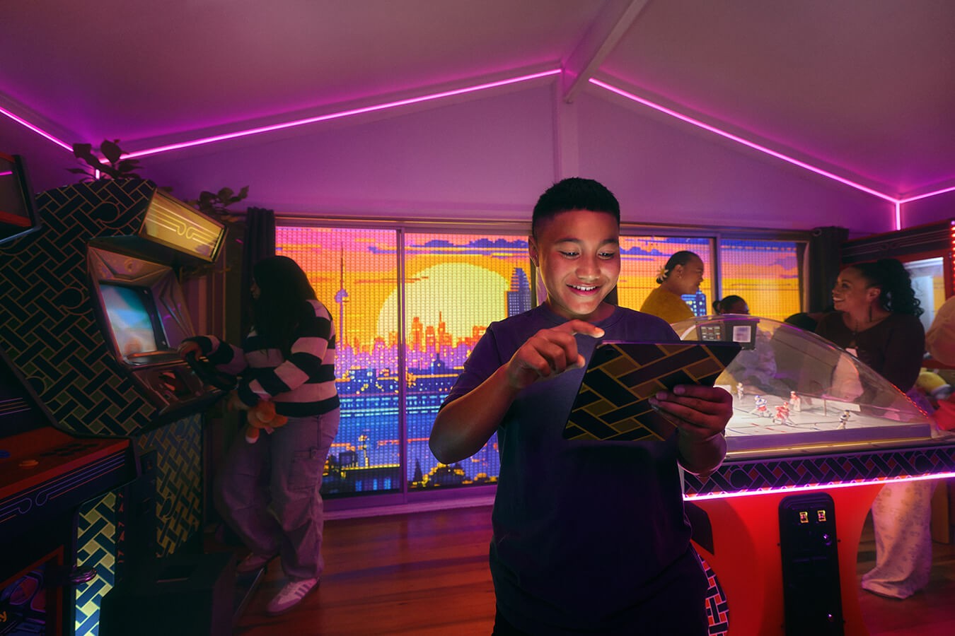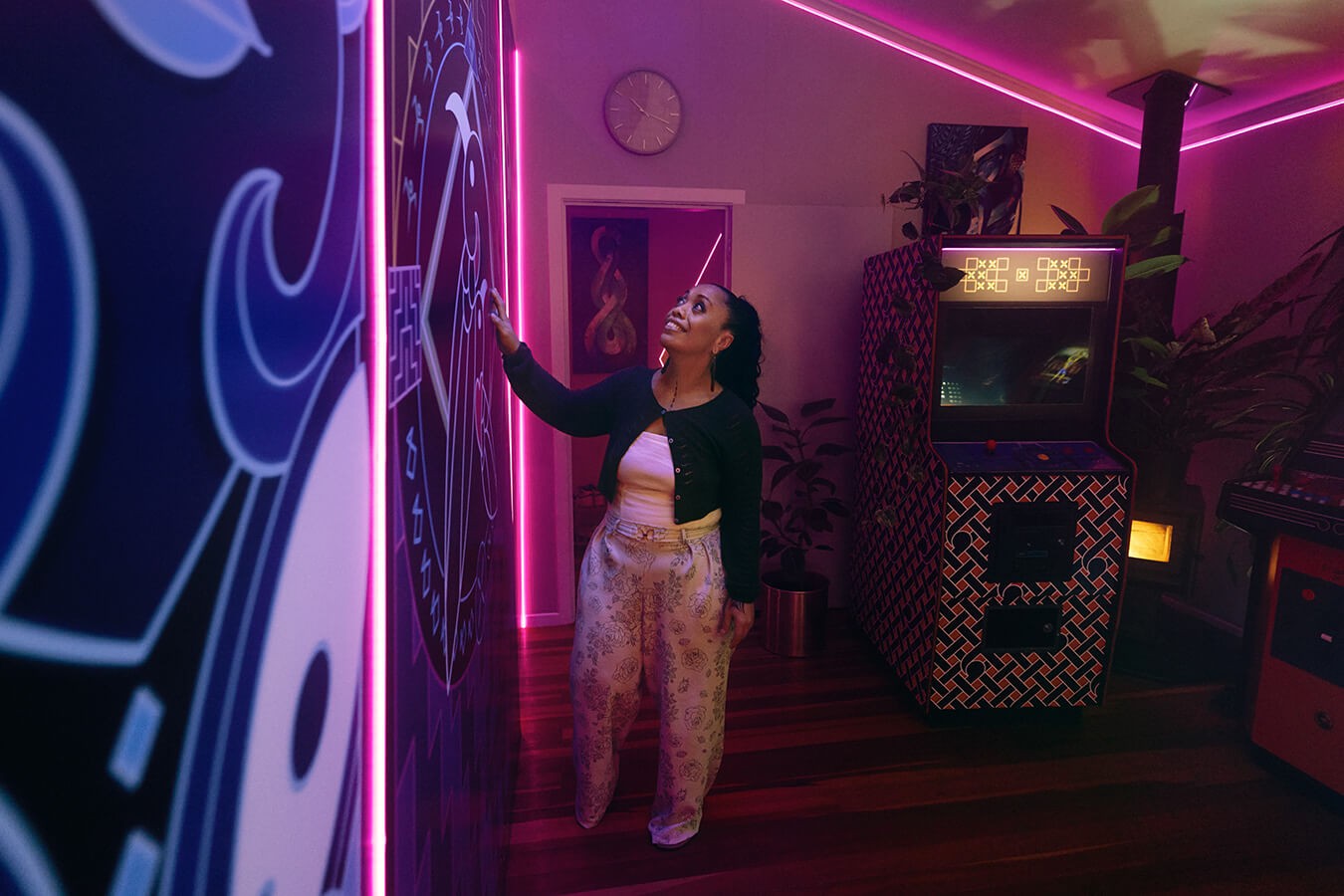 Mercury Energy's Free Power Day competition invites New Zealanders to dream up what they'd do with 24 hours of free electricity. The Nelson family from Ōtara, Auckland won - and Studio Dive was commissioned to transform their entire home into a fully working games arcade for the day. Pinball machines in the bedroom, arcade cabinets in the living room, a karaoke dance floor, and every window given a projected, gamified landscape the family could change at the touch of an iPad.